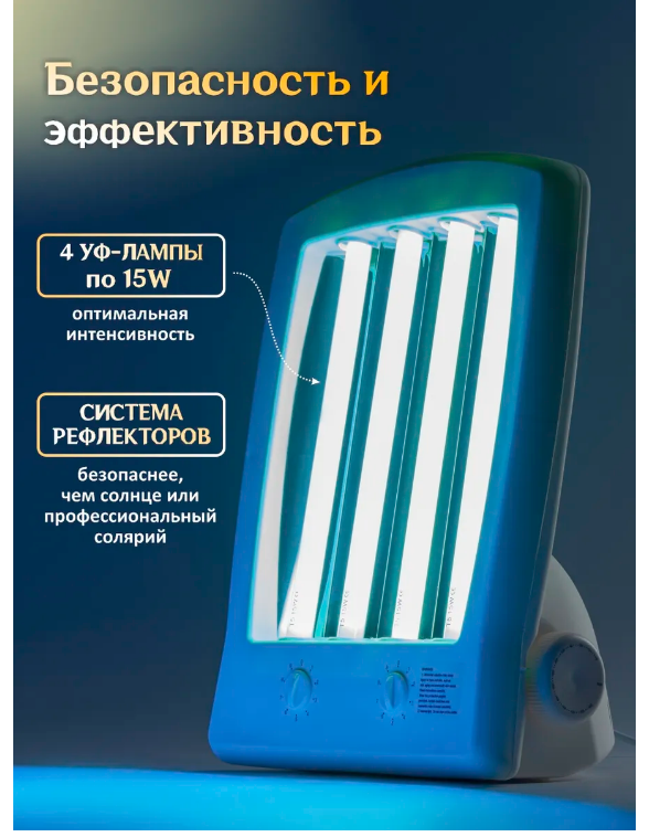 Легкий, ультракомпактный, безопасный домашний солярий с четырьмя УФ-излучателями подходит для комплексного воздействия: